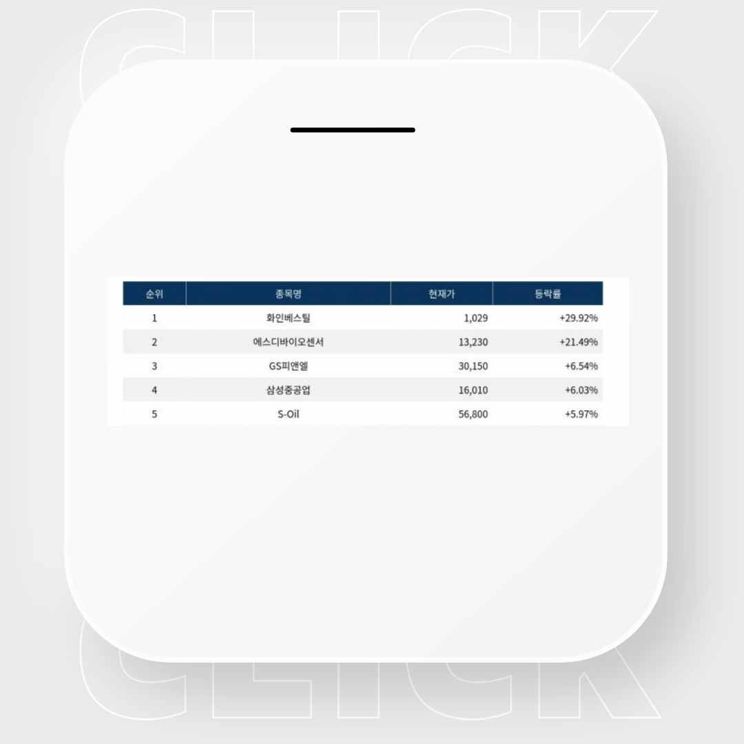- 상승률 TOP 5: 화인베스틸(상한가), 에스디바이오센서(+21.49%), GS피앤엘(+6.54%), 삼성중공업(+6.03%), S-Oil(+5.97%) 등이 상승세를 보였습니다.